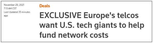 據(jù)路透社 11 月 29 日報(bào)道,11 家歐洲電信公司,包括德國電信(DTEGn.DE)、沃達(dá)豐(VOD.L)等大型歐洲電信企業(yè)的首席執(zhí)行官稱,美國科技巨頭應(yīng)該承擔(dān)歐洲電信網(wǎng)絡(luò)的部分費(fèi)用,因?yàn)檫@些公司耗費(fèi)的流量太多了。