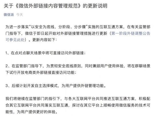 11 月 29 日消息,微信官方賬號“微信派”今日發(fā)布關(guān)于《微信外部鏈接內(nèi)容管理規(guī)范》的更新說明,于即日起開始對外部鏈接管理措施進行更新。