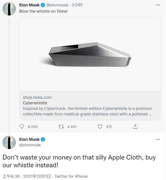 此外,特斯拉還不忘嘲諷蘋果一番:“不要在愚蠢的蘋果拋光布上花錢,快來(lái)買特斯拉哨子吧!”