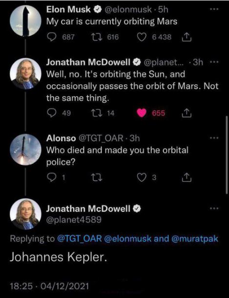 但麥克道爾也因?yàn)樯鲜鼋忉尪艿搅伺u。一位推特用戶給這位天體物理學(xué)家寫道:“是誰死了,讓你當(dāng)軌道警察的?”麥克道爾回復(fù)稱“約翰內(nèi)斯·開普勒(Johannes Kepler)”。他是 17 世紀(jì)的天文學(xué)家,提出了行星運(yùn)動的三大定律。但無論是繞太陽還是火星軌道飛行,馬斯克的跑車都是一次令人印象深刻的太空旅行。
