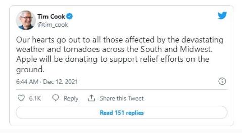 Cook 寫道:“我們向所有受到南方和中西部毀滅性天氣和龍卷風(fēng)影響的人表示同情。蘋果公司將捐款支持當(dāng)?shù)氐木仍ぷ鳌?rdquo;
