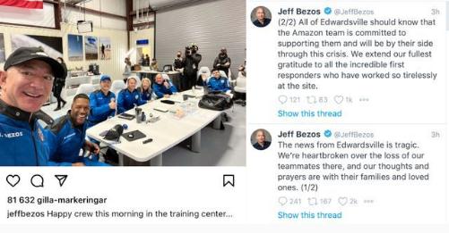 幾小時(shí)后,貝索斯在個(gè)人社交媒體 Twitter 上寫道:“來自愛德華茲維爾的消息讓人悲痛的。我們對(duì)這次事故中失去的同伴感到心碎,我們的思念和祈禱與他們的親人同在。”
