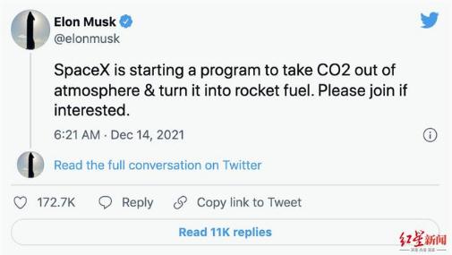 據(jù)外媒報道,在馬斯克當(dāng)選《時代》年度人物之際,他在推特上發(fā)文透露,SpaceX 公司正式啟動一項新的計劃,將大氣中的二氧化碳轉(zhuǎn)化為火箭燃料。他聲稱該計劃對未來的火星探索很重要,專注于減少大氣中的二氧化碳,可以為地球和航天公司取得雙贏。