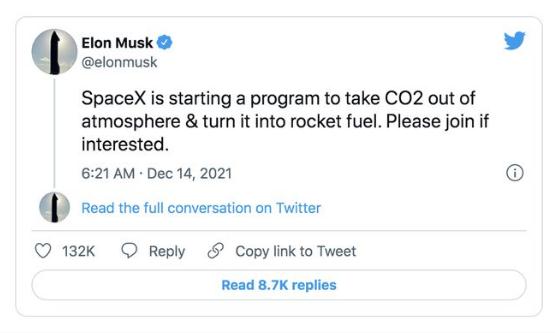馬斯克發(fā)布推文稱,“SpaceX 正在啟動一項計劃,從地球大氣層中去除二氧化碳,并將其用作火箭燃料。”他補充說:“如果對這個項目感興趣,請加入我們。”
