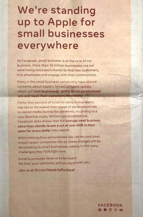 愛范兒曾寫過,《金融時(shí)報(bào)》的一項(xiàng)調(diào)查發(fā)現(xiàn),自從今年 4 月蘋果開始實(shí)行新的隱私設(shè)置,F(xiàn)acebook 等四大社交平臺(tái)損失近百億美元。2020 年 12 月,F(xiàn)acebook 曾用整版報(bào)紙廣告批評這項(xiàng)隱私設(shè)置,認(rèn)為它將傷害依賴個(gè)性化廣告的小型企業(yè)。