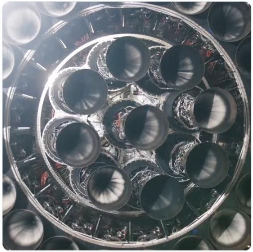 視頻中可以看到,火箭底部的發(fā)動(dòng)機(jī)有 29 個(gè),中央的 9 個(gè)發(fā)動(dòng)機(jī)為一組,可以大范圍旋轉(zhuǎn)改變方向,便于火箭姿態(tài)的調(diào)整。
