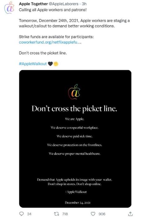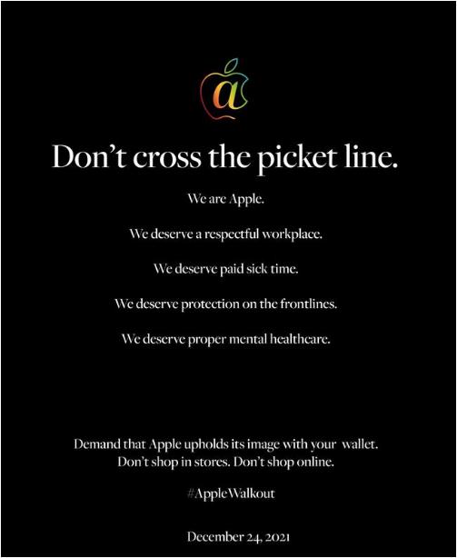 盡管 Apple Together 目標(biāo)是讓所有蘋果員工罷工或觸動(dòng),但其也呼吁顧客平安夜不要在蘋果購物。