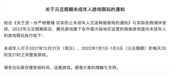 12 月 26 日消息,據(jù)“騰訊游戲”微信公眾號(hào)消息,騰訊游戲發(fā)布通知稱, 2022 年元旦假期前后,騰訊游戲旗下在中國大陸地區(qū)運(yùn)營的網(wǎng)絡(luò)游戲面向未成年人的游戲限玩執(zhí)行如下:未成年人可于 2021 年 12 月 31 日(周五)、 2022 年 1 月 1 日- 1 月 3 日(元旦假期)的每天 20 時(shí)至 21 時(shí)之間登錄游戲。