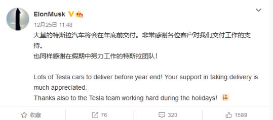 近日,特斯拉 CEO 埃隆·馬斯克發(fā)博稱:“大量的特斯拉汽車將會在年底前交付,非常感謝各位對我們交付工作的支持,也同樣感謝在假期中努力工作的特斯拉團(tuán)隊!”