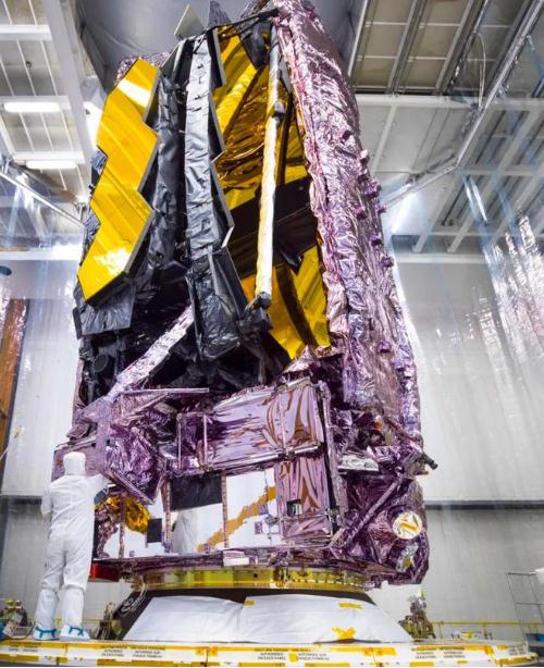 圖2:韋伯太空望遠(yuǎn)鏡在發(fā)射前完全折疊在阿麗亞娜 5 號(hào)火箭的頂部