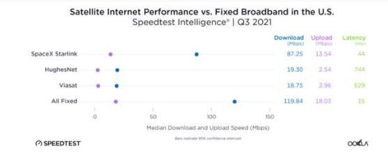 根據(jù)數(shù)據(jù)服務(wù)公司 Ookla(Speedtest)的最新測速報告,星鏈在美國的中位下載速度從今年二季度的 97.23Mbps 下降至三季度的 87.25Mbps。關(guān)于降速的原因,合理的推測是用戶數(shù)量的顯著增加,超過了服務(wù)能力的提升。仍需說明的是,已經(jīng)在近地軌道上部署千余顆衛(wèi)星的星鏈依然是速度最快的服務(wù)商。