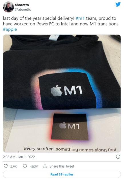 蘋(píng)果公司高級(jí)軟件工程師 Andy Boretto 在推特上發(fā)布了一張印有 M1 芯片及其伴隨的光芒的特殊 T 恤的圖片,旁邊還有一張?zhí)O果公司的卡片,上面寫(xiě)著:“每隔一段時(shí)間,就會(huì)有一些東西出現(xiàn),改變一切。恭喜你,感謝你幫助使蘋(píng)果 M1 成為可能!”