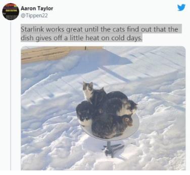 “星鏈效果很好,直到貓發(fā)現(xiàn)天線在寒冷的日子里會散發(fā)出一點(diǎn)熱量,”這位名叫阿隆·泰勒的網(wǎng)友說道。