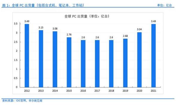 根據(jù)IDC在1月12日發(fā)布的初步數(shù)據(jù),2021年全球PC出貨量同比大增14.8%,重返2012年的3.49億臺高位,較2017年行業(yè)低點反彈了34%以上。
