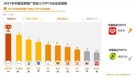 第五至第八名集中在 100 億-500 億區(qū)間內(nèi),分別為京東、美團(tuán)、快手和小米四家企業(yè)。最后擠入榜單前十的是微博和拼多多,廣告收入不足 100 億元。其中,拼多多擠掉奇虎 360 進(jìn)入榜單前十。