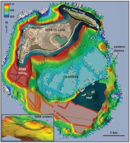 奧克蘭大學的火山學家克羅寧(Shane Cronin)解釋道,2014年底至2015年初的噴發(fā)形成了一個新的火山錐,將附近的Hunga Tonga和Hunga Ha'apai兩個島連接起來,形成了一個約5公里長的島嶼。