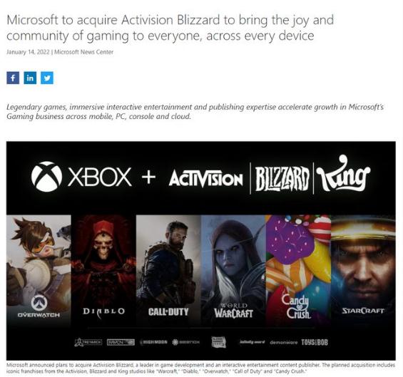 1 月 18 日,微軟公司宣布計劃收購游戲開發(fā)和互動娛樂內(nèi)容發(fā)行商動視暴雪公司。據(jù)其官網(wǎng)公告顯示,此次收購將加速微軟游戲業(yè)務(wù)在移動、PC、游戲機(jī)和云領(lǐng)域的增長,并將為搭建元宇宙提供基礎(chǔ)。