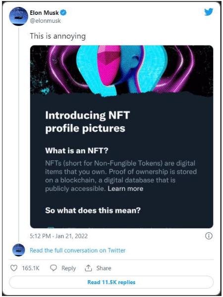 1月22日消息,據(jù)外媒報(bào)道,美國(guó)當(dāng)?shù)貢r(shí)間周四,社交媒體推特宣布將在其訂閱服務(wù)Twitter Blue上推出一項(xiàng)計(jì)劃,讓iOS用戶使用NFT作為他們的頭像。特斯拉首席執(zhí)行官埃隆·馬斯克(Elon Musk)隨后立即表達(dá)了自己的不滿,批評(píng)其浪費(fèi)資源。
