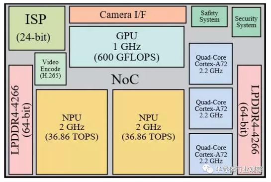 從架構(gòu)上來看,F(xiàn)SD 芯片不但有傳統(tǒng)的 CPU 和 GPU 部分,還加入了特別定制的 NNP(Neural Network Processor)、ISP 等部分,共同組成了一個龐大的 SoC 芯片。其中 CPU 采用的是 Cortex-A72 架構(gòu),三組、每組 4 個核心,一共有 12 個核心,最高運(yùn)行頻率為 2.2GHz,這部分處理器核心用于通用的計算和任務(wù)。GPU 方面,特斯拉設(shè)計了一個支持 FP32 和 FP64 的 GPU 模塊,主頻最高 1GHz,最高計算能力約為 600GFLPS。