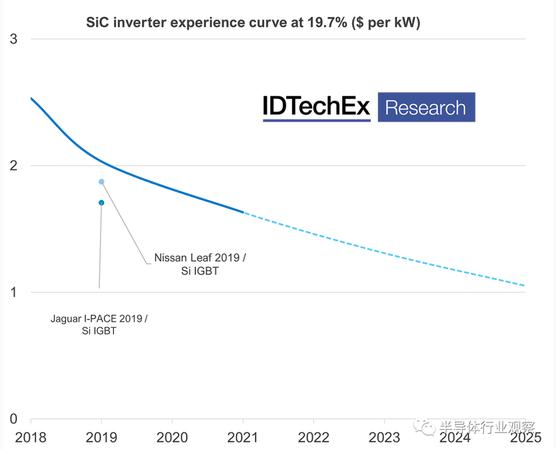 如同其他新型器件一樣,碳化硅逆變器也面臨著高昂的成本問題,但在特斯拉看來,這或許不會再成為困擾所在。IDTechEx 根據(jù) 2018 年 Model 3 逆變器和 2020 年 Model Y 第二代逆變器的成本估算,在過去短短三年內(nèi),特拉斯的 SiC 逆變器成本大幅下降,其成本幾乎與 2019 款日產(chǎn)聆風(fēng)和捷豹I-PACE 的硅基 IGBT 模塊相當(dāng)。