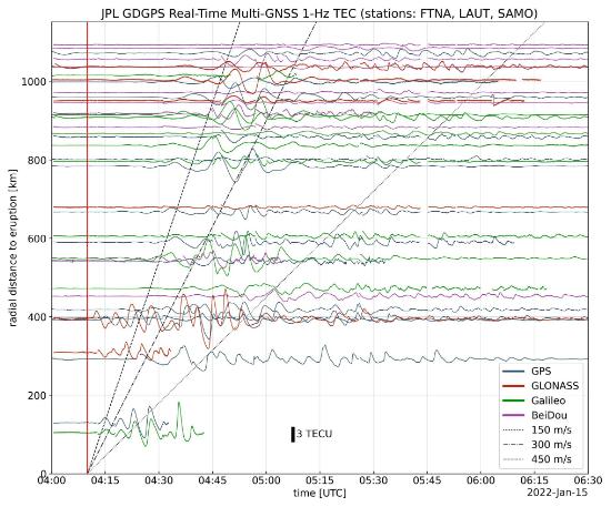 爆發(fā)還引起了海嘯,海嘯被爆炸的大氣壓力波所加強(qiáng)--這種現(xiàn)象被稱為氣象海嘯( meteotsunami)。這些大浪造成的海洋表面的變形進(jìn)一步擾亂了電離層。GDGPS實(shí)時(shí)觀察到由爆炸和隨后的氣象海嘯引起的電離層擾動(dòng)。該系統(tǒng)通過(guò)跟蹤全球?qū)Ш叫l(wèi)星系統(tǒng)(GNSS)信號(hào)穿越大氣層時(shí)的延遲來(lái)監(jiān)測(cè)電離層中電子的密度(以總電子含量單位衡量,或稱TECU)。