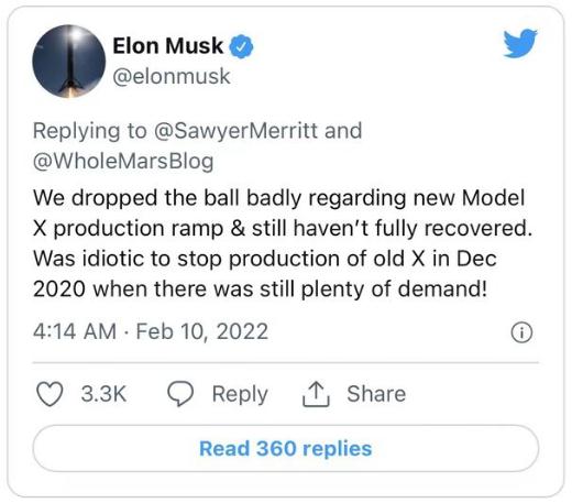 馬斯克寫道:“我們?cè)谛驴?Model X 的生產(chǎn)安排上嚴(yán)重失誤,目前還沒有完全恢復(fù)。”“2020 年 12 月,市場(chǎng)需求仍然很大,我們卻停止生產(chǎn)老款 Model X,真是愚蠢!”
