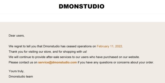 Dmonstudio網(wǎng)站主頁刊登的致消費者的公告顯示,Dmonstudio已于2022年2月11日停止運營,但已經(jīng)在網(wǎng)站上購買了商品的消費者,可以繼續(xù)享受售后服務(wù)。如果消費者對訂單有任何疑問,都可以通過郵件聯(lián)系到Dmonstudio團(tuán)隊。