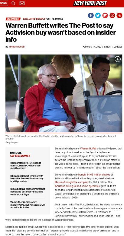 據(jù)《紐約郵報(bào)》報(bào)道,巴菲特否認(rèn)了他或伯克希爾·哈撒韋的其他投資者在奧馬哈企業(yè)集團(tuán)收購動(dòng)視暴雪的10億美元股份之前就已預(yù)先了解微軟收購動(dòng)視暴雪的計(jì)劃——他在一封電子郵件中告訴《紐約郵報(bào)》,他想要澄清有關(guān)這項(xiàng)交易的“錯(cuò)誤信息”。