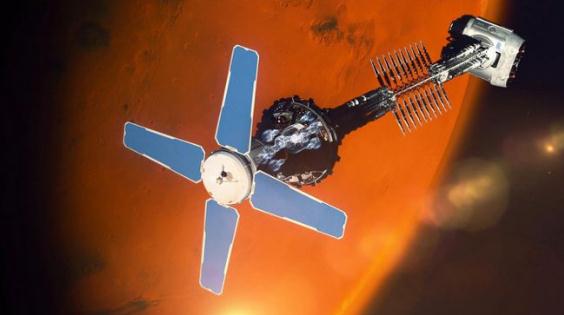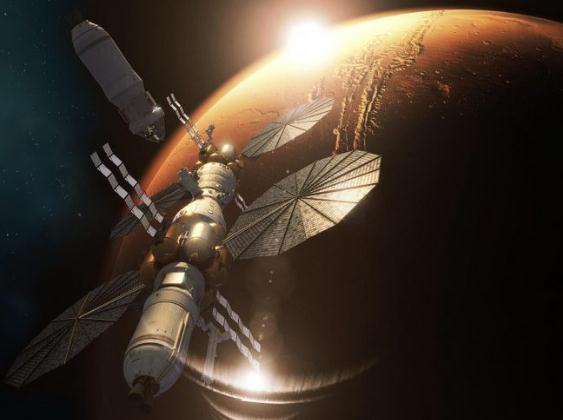 藝術(shù)家對(duì)火星軌道上的火星基地營(yíng)的印象。當(dāng)前往火星的任務(wù)開(kāi)始時(shí),最大的風(fēng)險(xiǎn)之一將是空間輻射所帶來(lái)的風(fēng)險(xiǎn)。