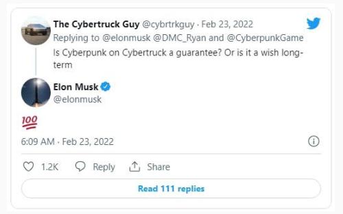 馬斯克還在回答另一個(gè)問(wèn)題時(shí),確認(rèn) Cybertruck 電動(dòng)皮卡將支持玩《賽博朋克 2077》游戲,IT 之家了解到,Cybertruck 預(yù)計(jì)將于 2023 年開(kāi)始交付。