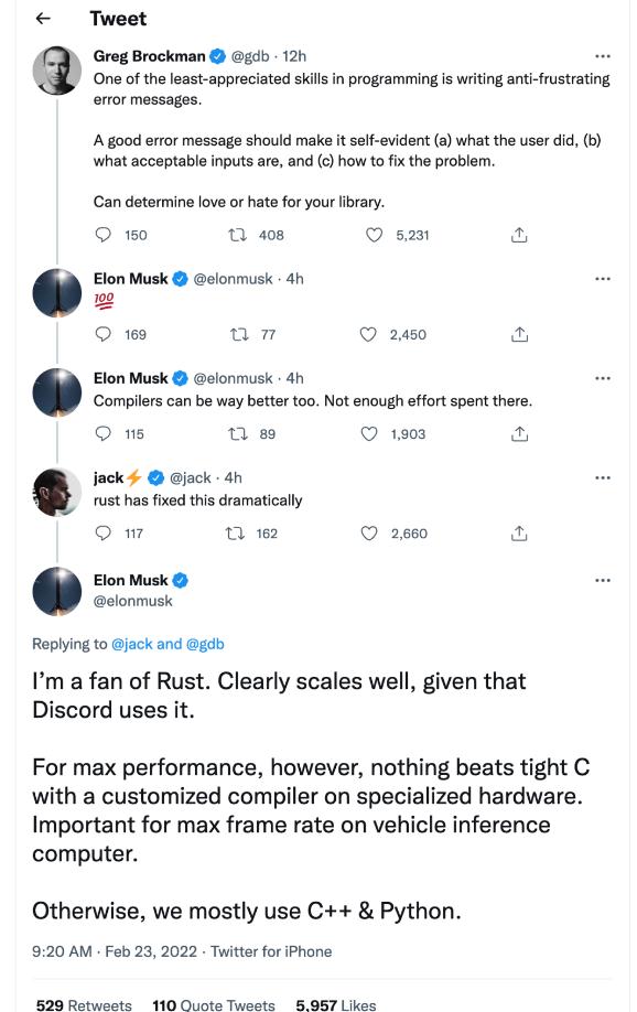 馬斯克也在這條推文評論了自己的看法,他完全同意此觀點,還表示編程語言的編譯器可以做得更好,因為目前在編譯器上的投入還不夠多。