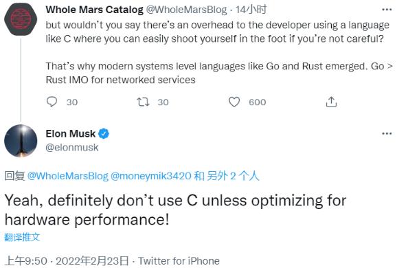 馬斯克回復稱,他也是 Rust 的粉絲,十分認可 Rust 的擴展性。不過為了獲得最大化的性能,最好的方案還是在專門的硬件上使用包含定制編譯器的 C 語言。這對汽車上的推斷計算機上的最大幀率 (max frame rate) 十分重要。其他場景他們主要使用 C++ 和 Python。他還強調(diào)道,除非需要針對硬件性能進行優(yōu)化,否則絕對不要使用 C!