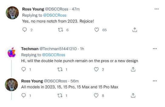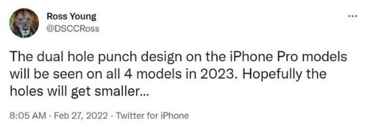 顯示器行業(yè)分析師Ross Young通過Twitter表示,iPhone Pro機型的“雙打孔”設計將在2023年的4款機型上全部出現(xiàn)。