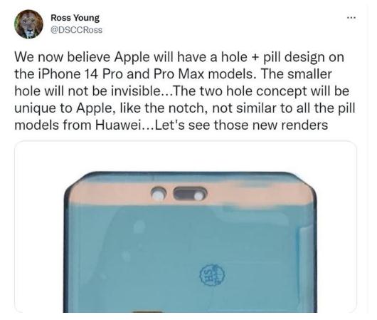 Ross Young也直言,希望這些孔會變得更小。今年早些時候,Ross Young便首次曝光了iPhone 14 Pro的“打孔 + 藥丸”設計,稱iPhone 14 Pro 機型將在顯示屏頂部附近同時采用圓形和藥丸狀的打孔,形成一個類似“感嘆號”的形狀。