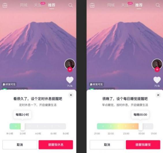 近日,抖音升級(jí)時(shí)間管理工具,加強(qiáng)對(duì)老年用戶的休息提醒。用戶可自行設(shè)置休息提醒和睡眠提醒時(shí)間,當(dāng)?shù)竭_(dá)約定時(shí)間后會(huì)收到風(fēng)景紀(jì)錄片內(nèi)容的提醒頁(yè)面。同時(shí),針對(duì)老年用戶的認(rèn)知行為特點(diǎn),頁(yè)面中會(huì)出現(xiàn)語(yǔ)音播報(bào),將提醒內(nèi)容語(yǔ)音告知用戶。