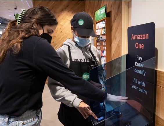 在這種模式里,進(jìn)入超市時(shí)要先進(jìn)行身份識(shí)別,顧客可以選擇掃描 Whole Foods Market 或亞馬遜應(yīng)用程序中的店內(nèi)代碼,在 Amazon One 上懸停手掌(Amazon One 使用包含專有計(jì)算機(jī)視覺(jué)算法的圖像掃描硬件來(lái)捕獲和加密手掌圖像),或插入與亞馬遜賬戶相關(guān)聯(lián)的信用卡或借記卡。
