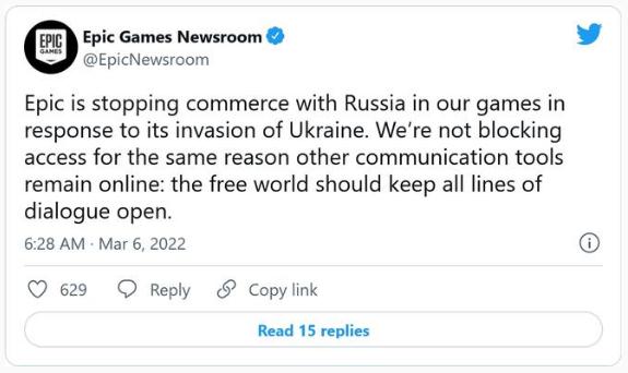 在動(dòng)視暴雪宣布后不久,Epic Games 表示,它在其游戲中“停止了跟俄羅斯的商業(yè)往來”,但它指出不會(huì)禁止俄羅斯玩家訪問這些游戲。目前還不清楚《堡壘之夜》開發(fā)商的商業(yè)禁令是否適用于微交易、游戲或兩者。