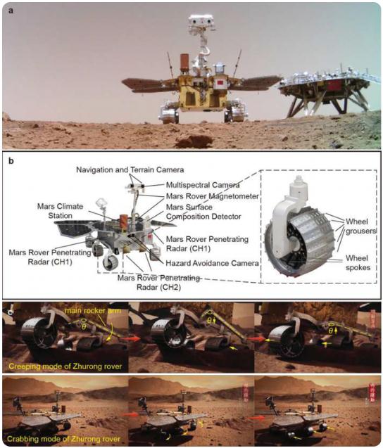 “祝融號”火星車,圖片來自論文“祝融號”高度為1.85米,重量約為240公斤。此次,研究人員利用“祝融號”運(yùn)動數(shù)據(jù)與相機(jī)圖像,確定它在前60個火星日里向南行進(jìn)的距離為450.9米,并通過分析“祝融號”輪子與下方地形的相互作用力以及避障相機(jī)拍攝的輪轍影像,推斷出著陸地點(diǎn)火星表面土壤具有較高的承載強(qiáng)度和粘聚力,還辨別出該區(qū)域符合風(fēng)蝕特性的地貌(如沙脊、波紋、侵蝕坑以及巖石紋理等),其中風(fēng)成床面形態(tài)以橫向沙脊為主,當(dāng)?shù)仫L(fēng)向?yàn)闁|北方向。同時,著陸地區(qū)顯示出平緩的地形狀況,其地表的主要地質(zhì)特征包括風(fēng)成床面形態(tài)、小隕石坑和巖石。這些初步發(fā)現(xiàn)表明“祝融號”火星車的著陸位置相較于其他火星著陸點(diǎn),具有更加明顯、易于研究的地貌特征,將有望對火星北半球低地的表面環(huán)境演化帶來更多見解。