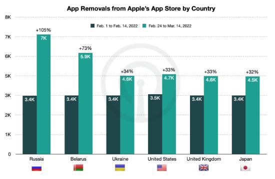 盡管蘋果經(jīng)常會(huì)從其 App Store 下架過時(shí)和被廢棄的應(yīng)用,但是俄羅斯 App Store 自戰(zhàn)后 (2 月 24 日到 3 月 14 日) 下架的應(yīng)用數(shù)量較 2 月前兩周 (2 月 1 日到 14 日) 增長(zhǎng)了 105%。在此之前的一個(gè)時(shí)期,俄羅斯 App Store 僅下架了 3404 個(gè)應(yīng)用,與其他市場(chǎng)的蘋果 App Store 下架的應(yīng)用數(shù)量相當(dāng),例如美國為 3422 款。