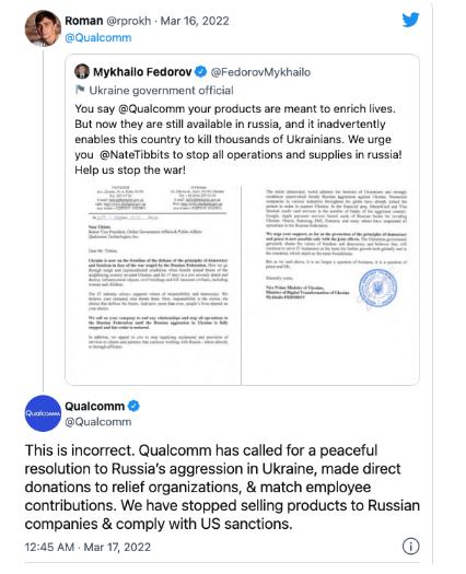 高通負(fù)責(zé)政府事務(wù)的高級副總裁內(nèi)特?提比茨 (Nate Tibbits) 在 Twitter 上披露了這一舉措,他是在回應(yīng)烏克蘭副總理米哈伊洛?費(fèi)多羅夫 (Mykhailo Fedorov) 的評論。