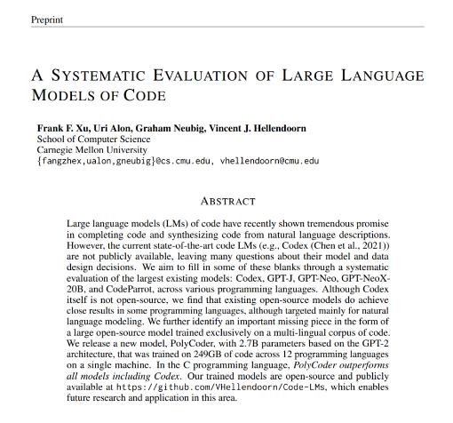 最近,卡內(nèi)基梅隆大學(xué)(Carnegie Mellon University)的研究人員發(fā)表了一篇論文 A SYSTEMATIC EVALUATION OF LARGE LANGUAGE MODELS OF CODE ,對(duì)比了現(xiàn)有的跨編程語(yǔ)言的編寫代碼模型——Codex、GPT-J、GPT-Neo、GPT-NeoX 和 CodeParrot。通過(guò)對(duì)多個(gè)模型的比較和分析,這個(gè)團(tuán)隊(duì)希望為代碼建模設(shè)計(jì)決策提供更多啟發(fā)。