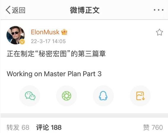 3 月 17 日,特斯拉 CEO 埃隆·馬斯克發(fā)布微博稱,“正在制定‘秘密宏圖’的第三篇章”。