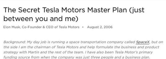 2006 年 8 月 2 日,馬斯克首次公布了其“秘密宏圖”,他在博文《特斯拉汽車的秘密宏圖(不要告訴別人)》中,介紹了特斯拉的四步計劃: