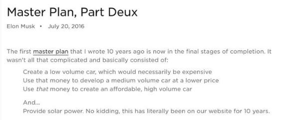 2016 年 7 月 20 日,馬斯克發(fā)表博文《秘密宏圖第二篇章》,表示 10 年前的規(guī)劃已處于最終收尾階段。
