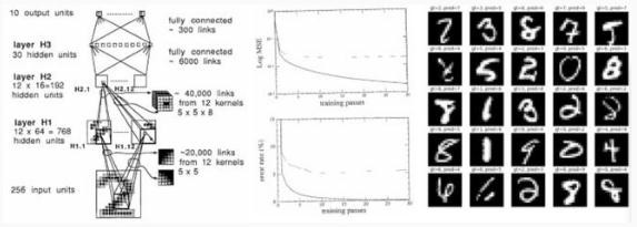 除了其使用的微型數據集(7291 個 16x16 的灰度數字圖像)和微型神經網絡(僅 1000 個神經元)顯得落伍之外,在 33 年后的今天,這篇論文讀來仍然十分新穎——它展示了一個數據集,描述了神經網絡結構、損失函數、優(yōu)化器,并報告了在訓練集和測試集上實驗得到的錯誤率。
