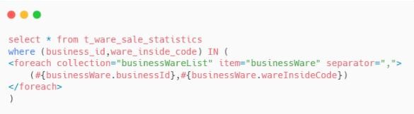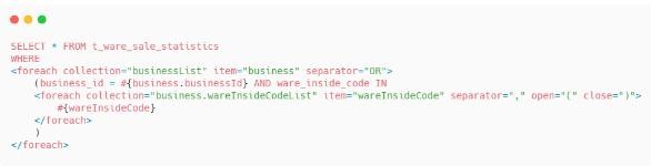 同樣是利用 Mybatis 的 動態(tài) SQL ,將 business_id 列表拼在一起、 ware_inside_code 拼在一起,類似如下