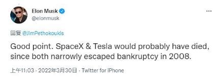 “好觀點(diǎn)。SpaceX 和特斯拉可能已經(jīng)死了,因?yàn)檫@兩家公司都在 2008 年險(xiǎn)些破產(chǎn)。”馬斯克回應(yīng)道。