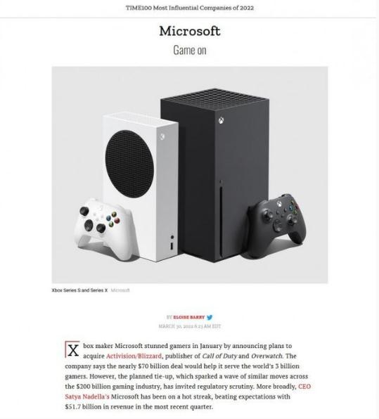《時代》周刊表示:“Xbox 制造商微軟在 1 月份宣布計劃收購《使命召喚》和《守望先鋒》的發(fā)行商動視/暴雪,這讓玩家感到震驚。該公司表示,這筆近 700 億美元的交易將幫助它為全球 30 億游戲玩家服務(wù)。然而,這一計劃中的合作,引發(fā)了整個 2000 億美元的游戲行業(yè)的類似舉措的浪潮,已經(jīng)招致了監(jiān)管部門的審查。更廣泛地說,首席執(zhí)行官薩蒂亞-納德拉的微軟公司一直處于火熱狀態(tài),最近一個季度的收入為 517 億美元,超過了預(yù)期”。