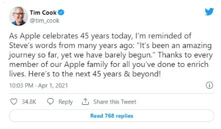去年 4 月 1 日,CEO 蒂姆?庫(kù)克在紀(jì)念蘋(píng)果公司成立 45 周年時(shí)發(fā)了一條推特,回顧了他的朋友和同事、聯(lián)合創(chuàng)始人史蒂夫?喬布斯。