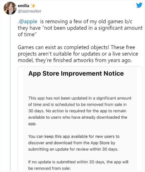 “您可以通過在 30 天內(nèi)提交更新以供審核,讓新用戶可以從 App Store 發(fā)現(xiàn)和下載此 App,”蘋果在電子郵件中寫道。“如果在 30 天內(nèi)沒有提交更新,該 App 將被下架。”